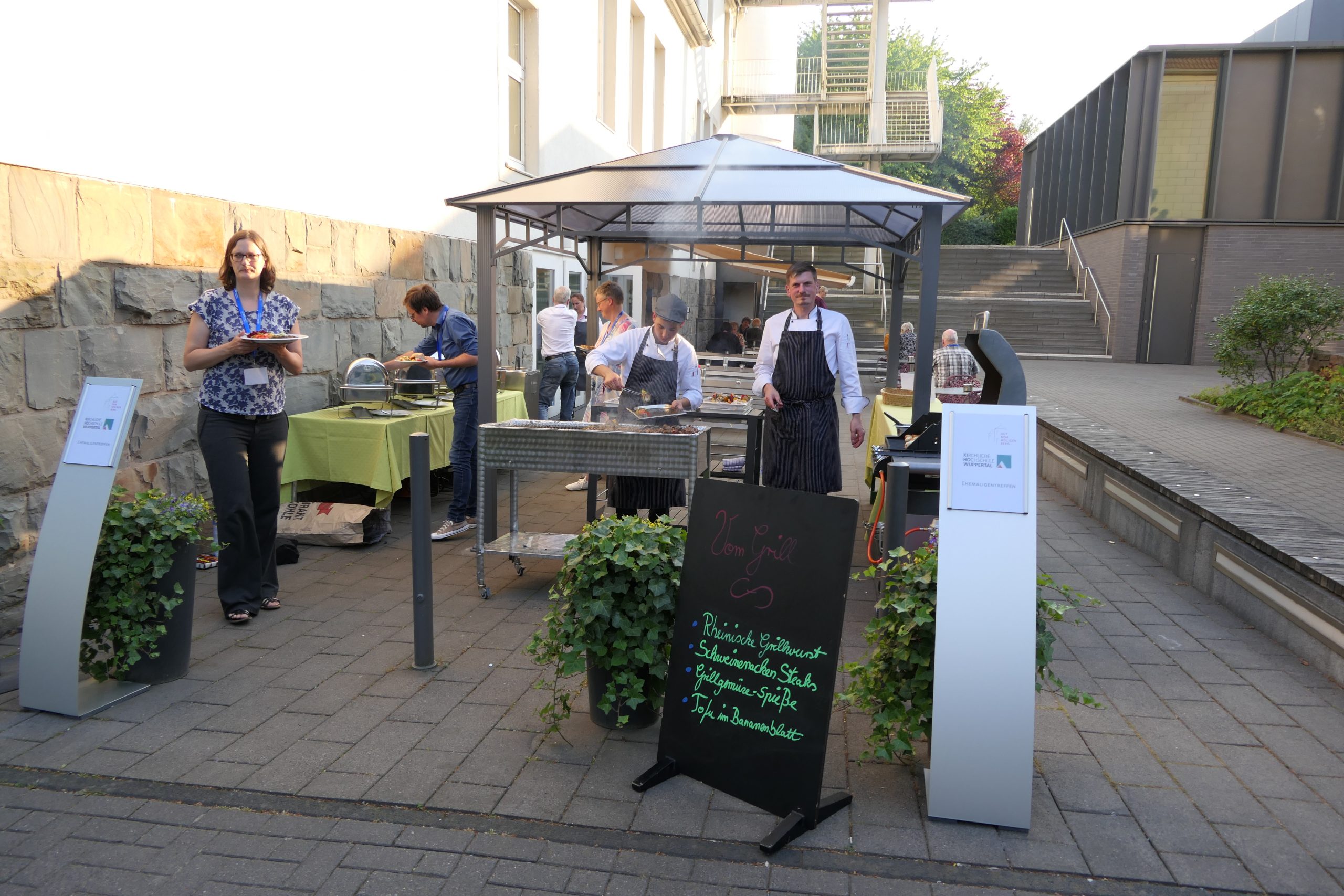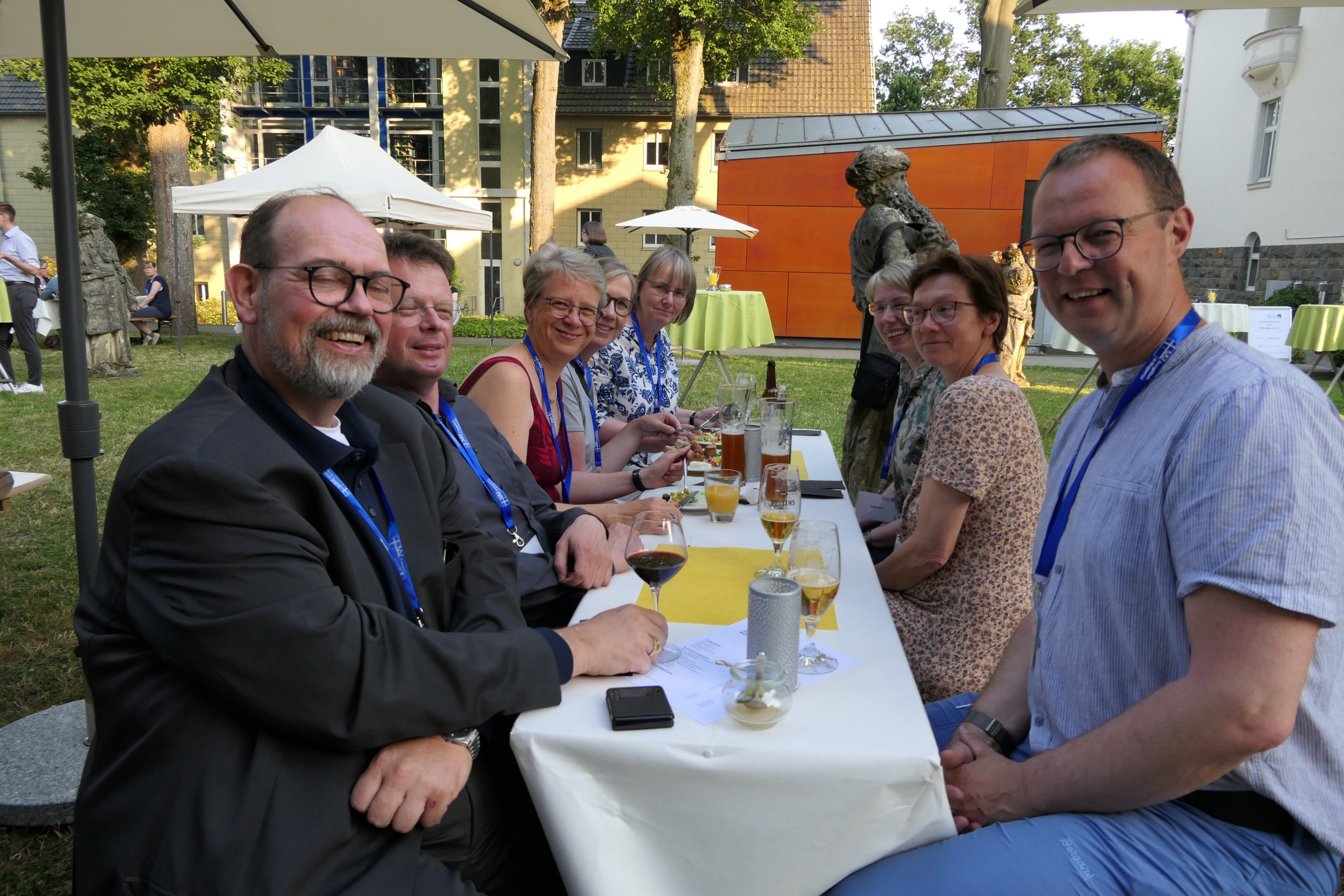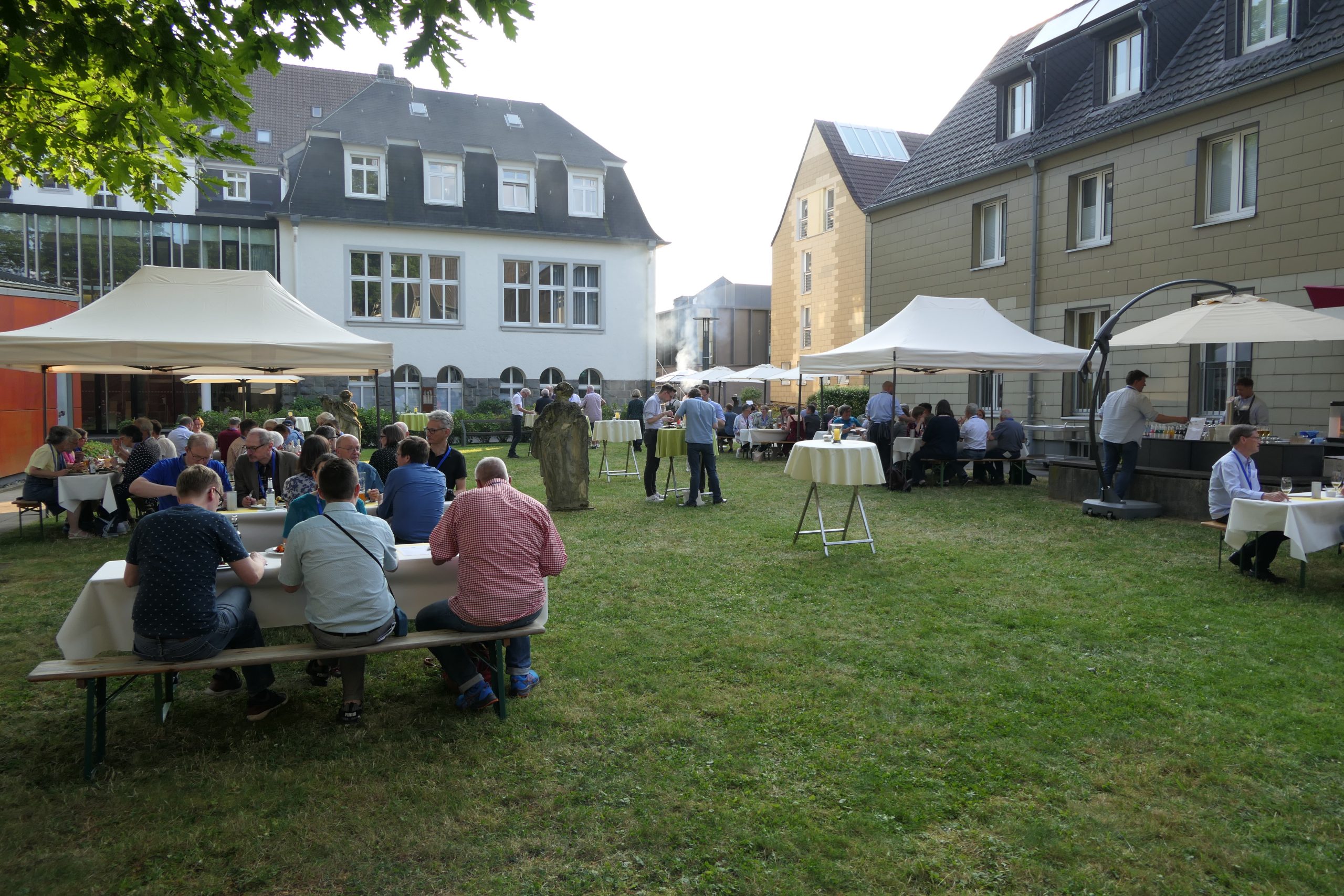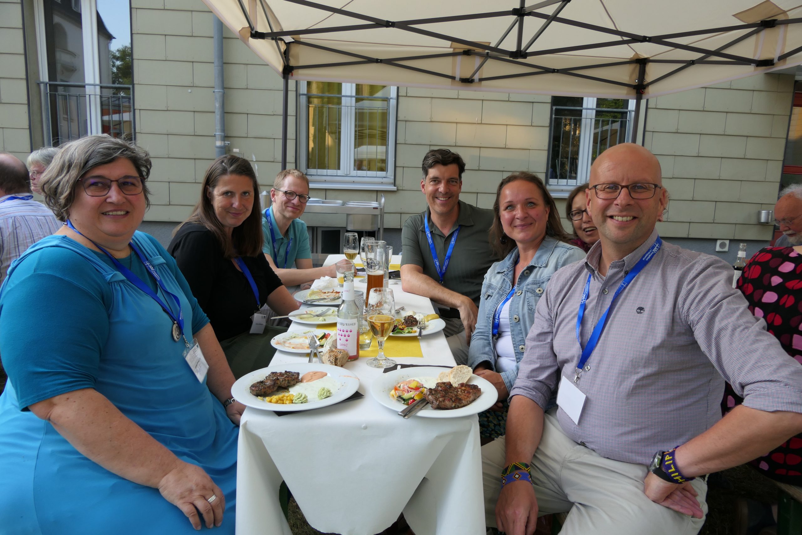 Um 19.00 Uhr startete der gesellige Teil des Abends und der persönliche Austausch auf der Campus- Wiese. Die Mitarbeitenden des Internationalen Evangelischen Tagungszentrums „Auf dem heiligen Berg“ hatten dank des hervorragenden Wetters nicht nur Bänke und Tische, sondern auch Grill und Theke nach draußen verlagert. Beste Voraussetzungen, um einen lauen Sommerabend mit alten Bekannten zu genießen.