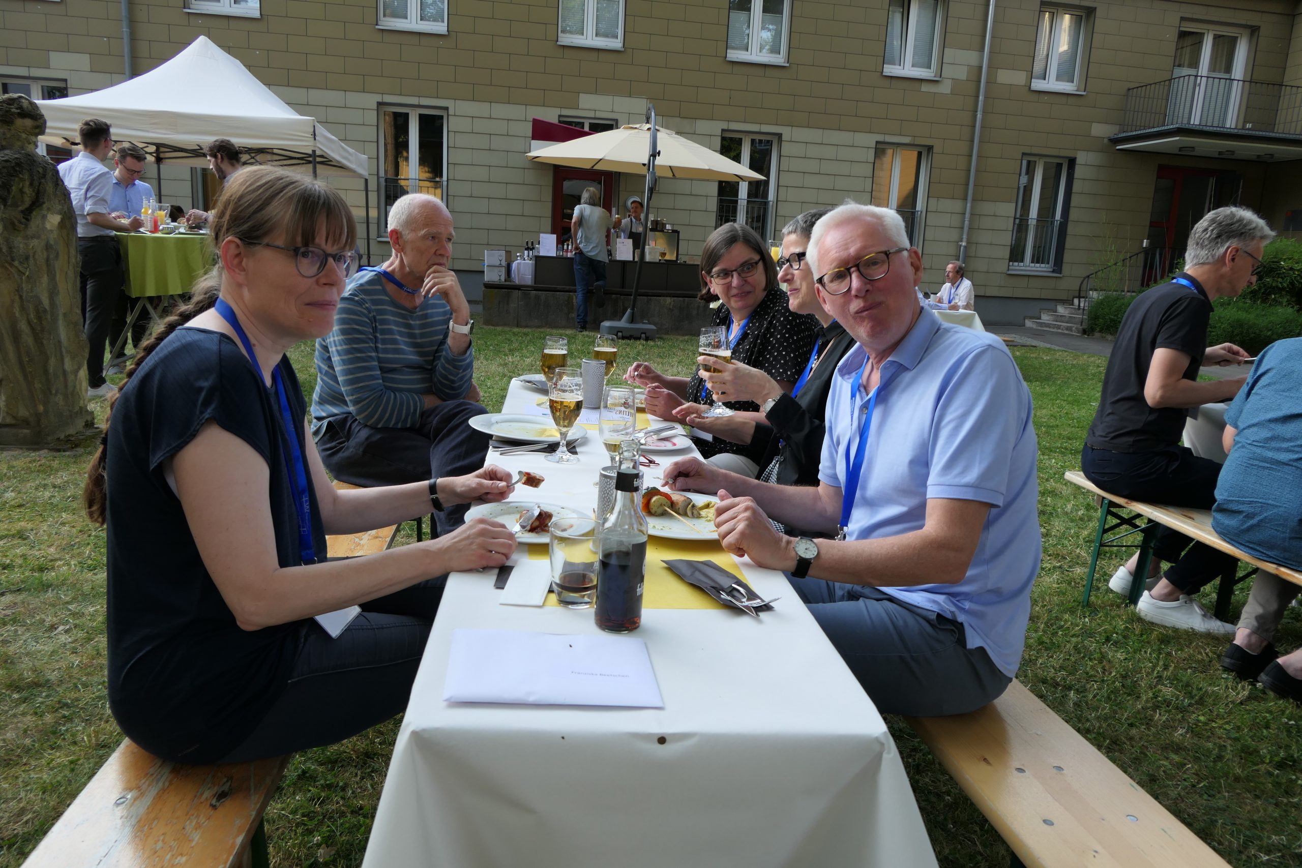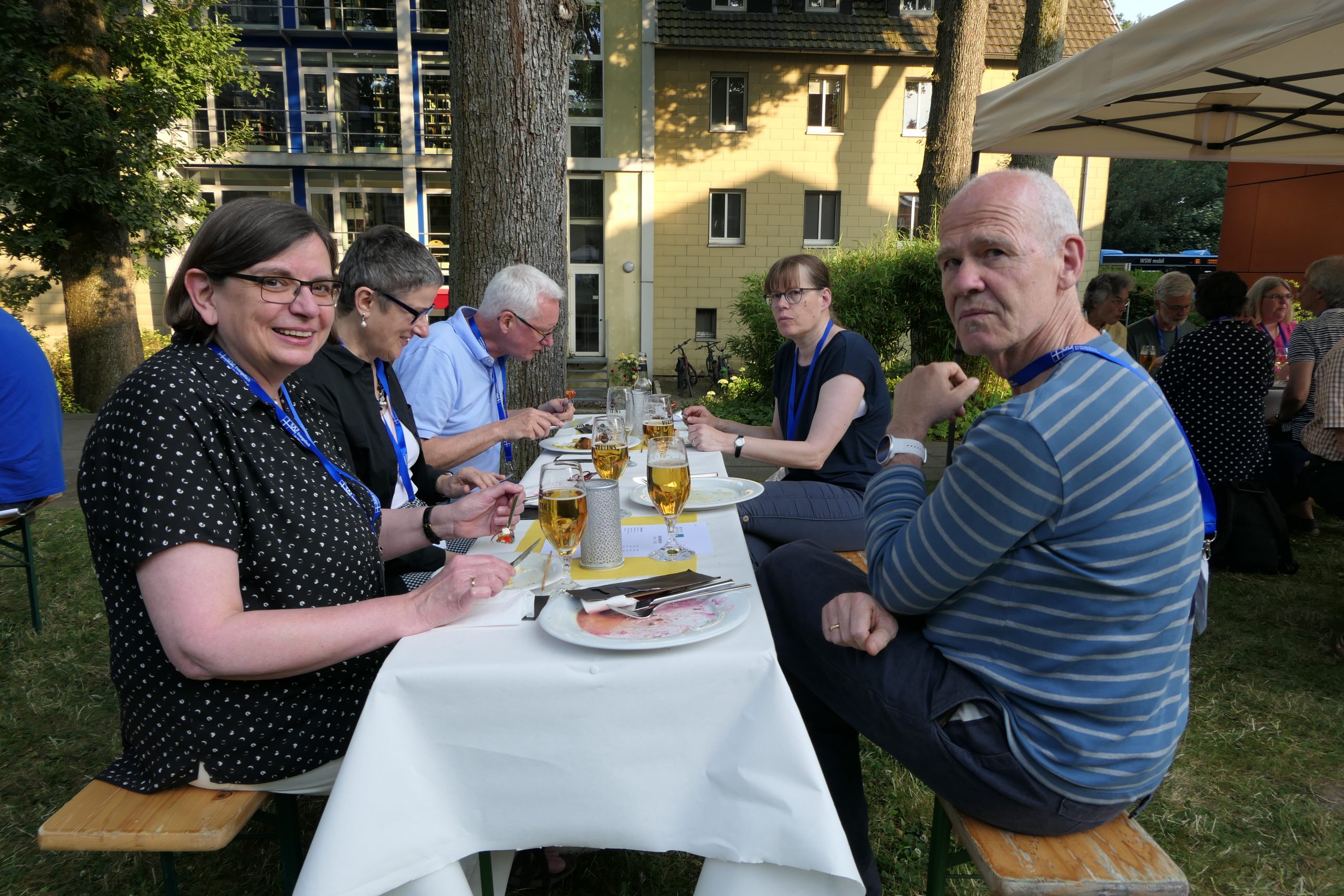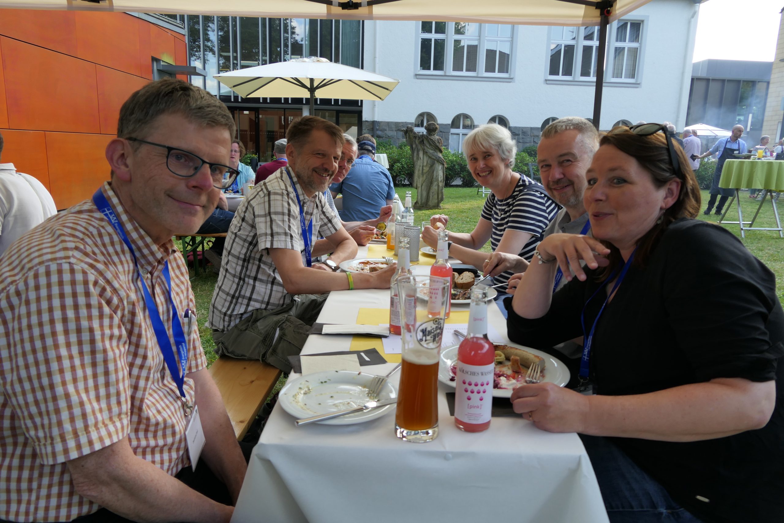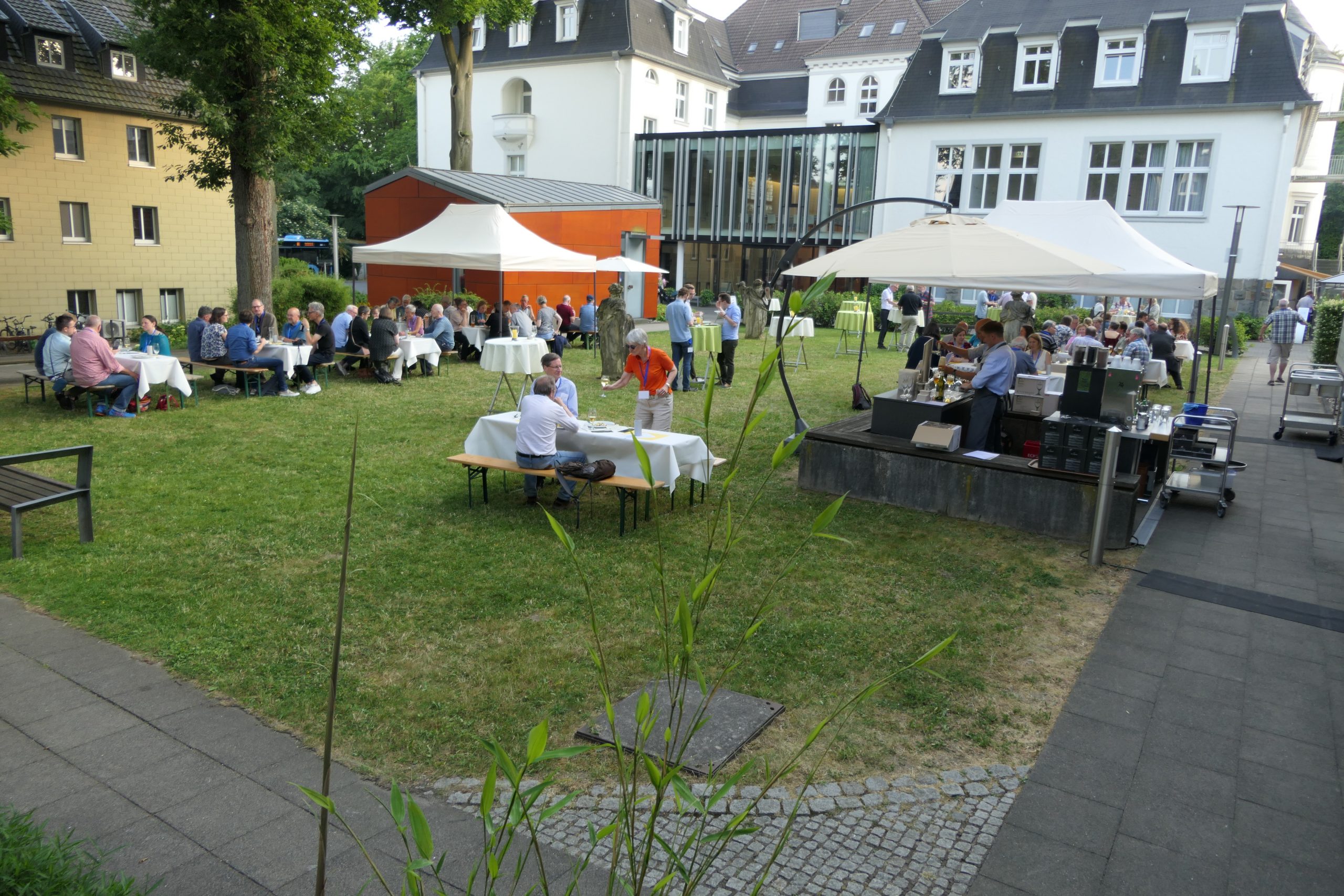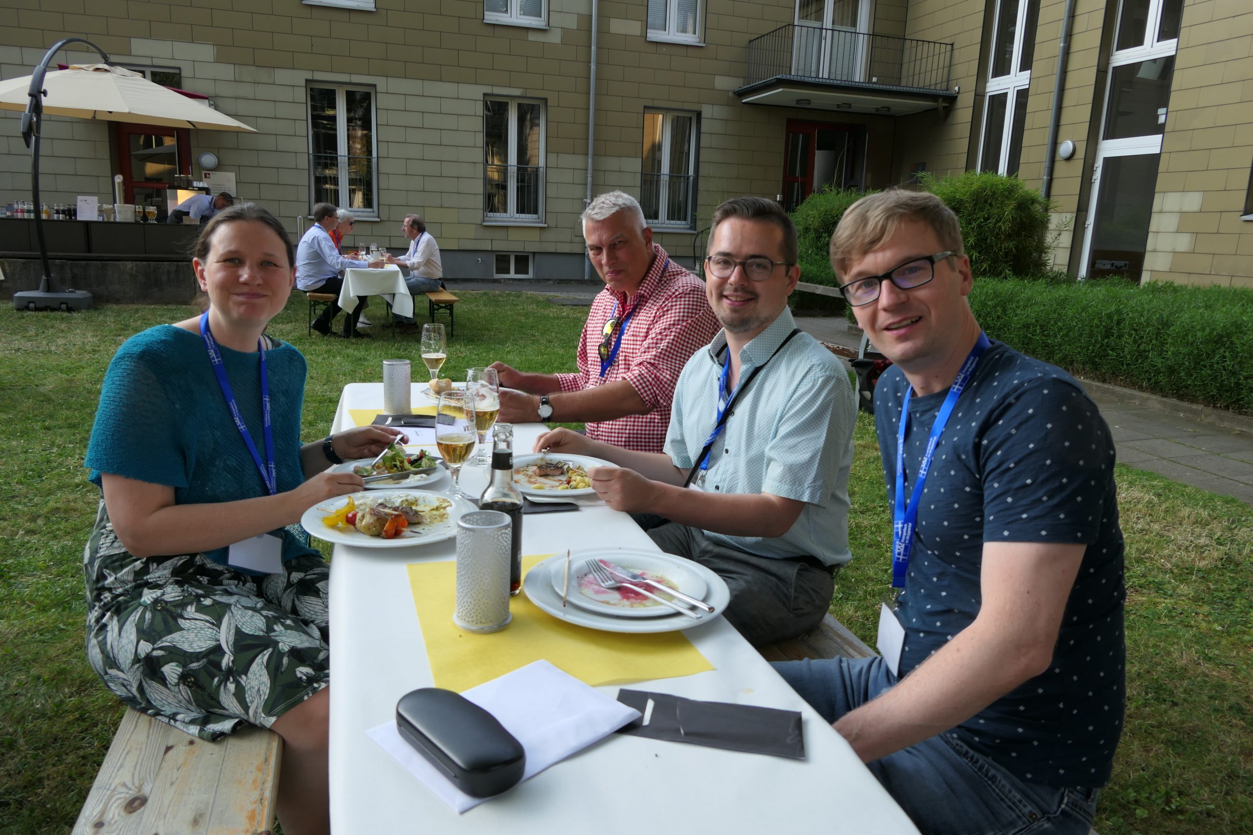 Um 19.00 Uhr startete der gesellige Teil des Abends und der persönliche Austausch auf der Campus- Wiese. Die Mitarbeitenden des Internationalen Evangelischen Tagungszentrums „Auf dem heiligen Berg“ hatten dank des hervorragenden Wetters nicht nur Bänke und Tische, sondern auch Grill und Theke nach draußen verlagert. Beste Voraussetzungen, um einen lauen Sommerabend mit alten Bekannten zu genießen.