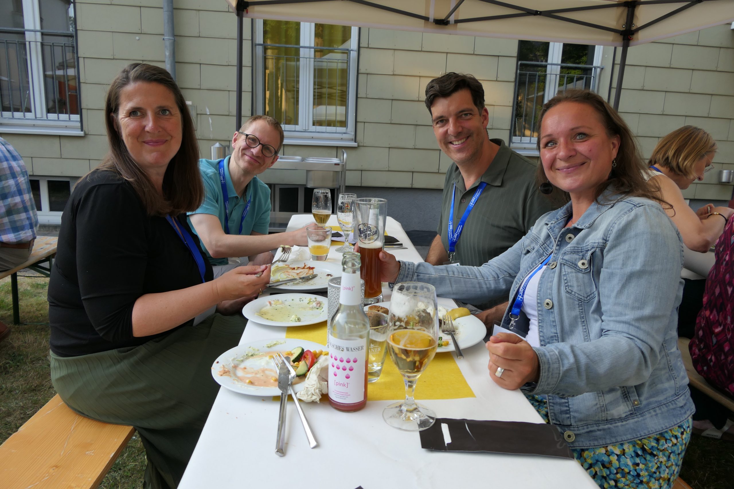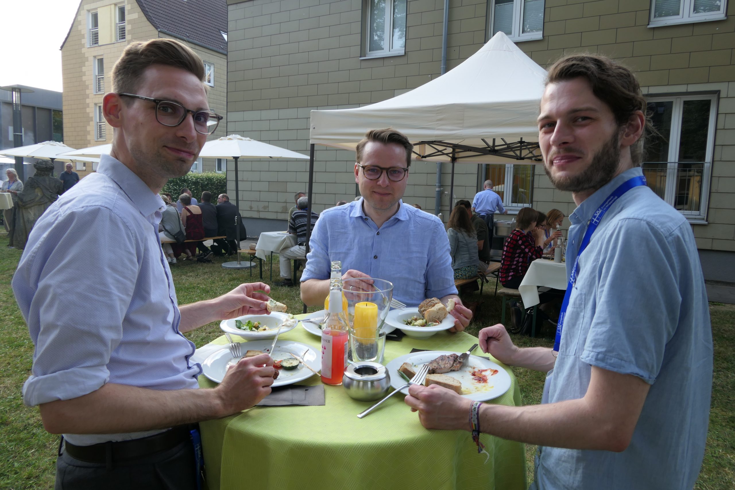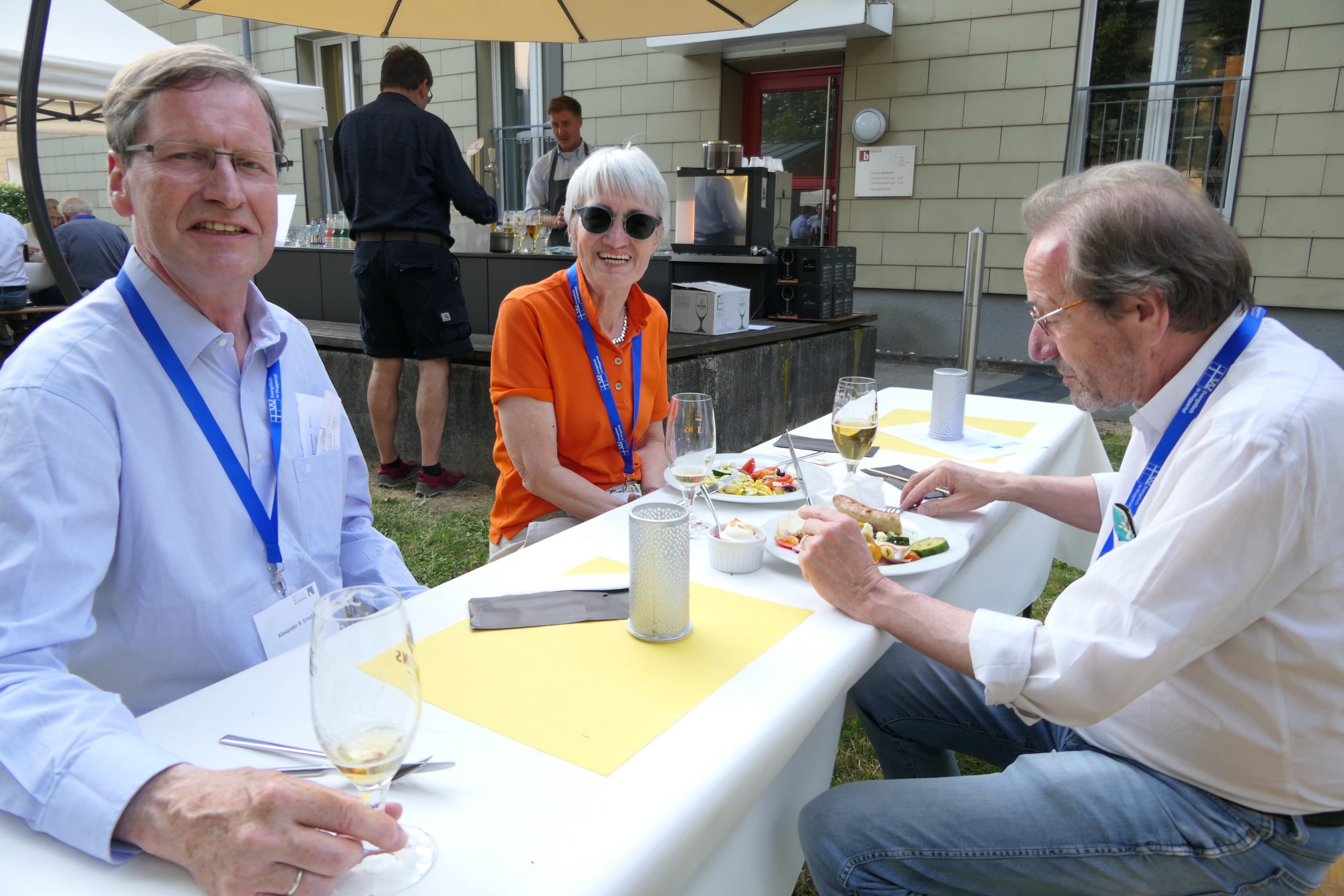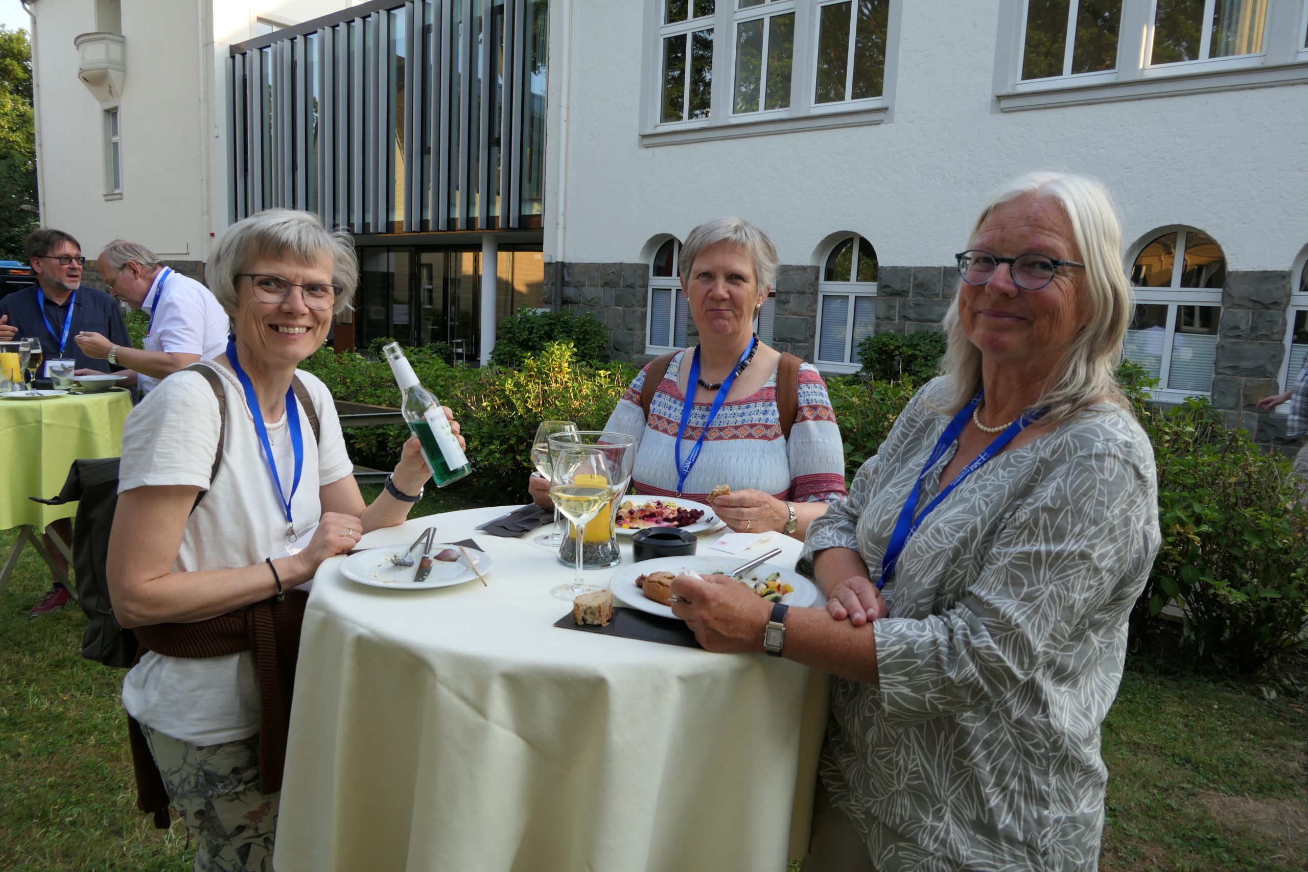 Um 19.00 Uhr startete der gesellige Teil des Abends und der persönliche Austausch auf der Campus- Wiese. Die Mitarbeitenden des Internationalen Evangelischen Tagungszentrums „Auf dem heiligen Berg“ hatten dank des hervorragenden Wetters nicht nur Bänke und Tische, sondern auch Grill und Theke nach draußen verlagert. Beste Voraussetzungen, um einen lauen Sommerabend mit alten Bekannten zu genießen.