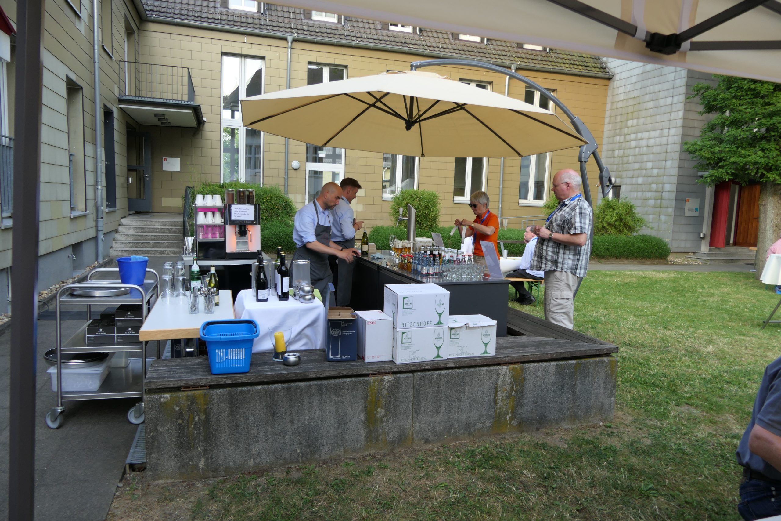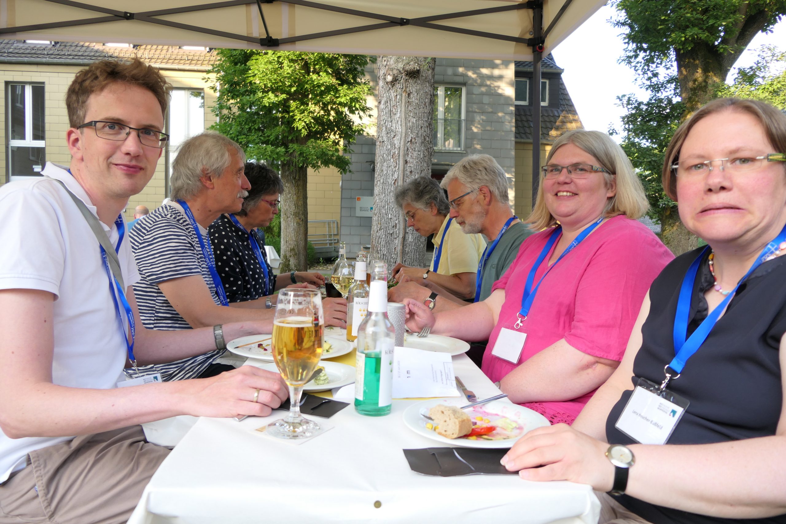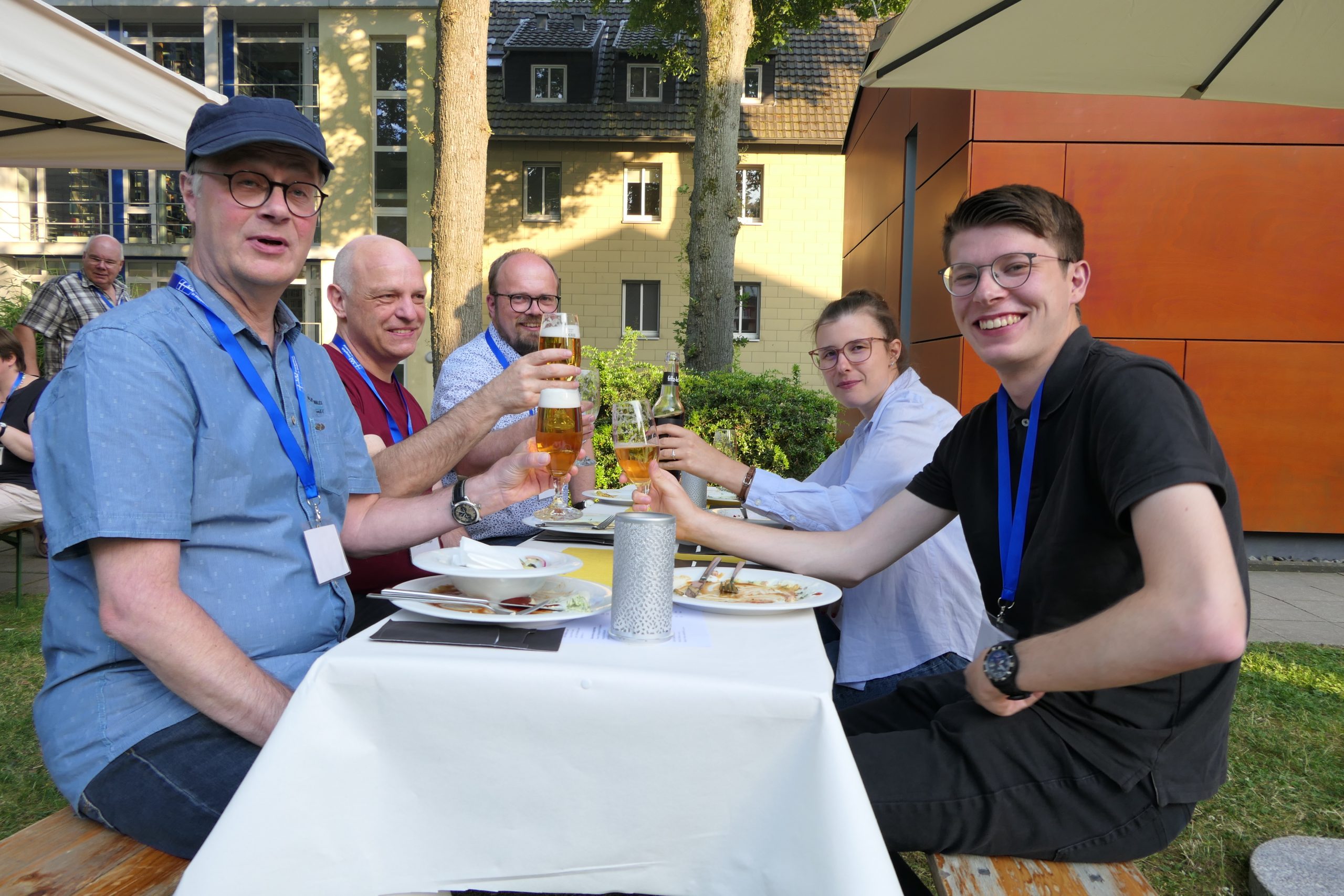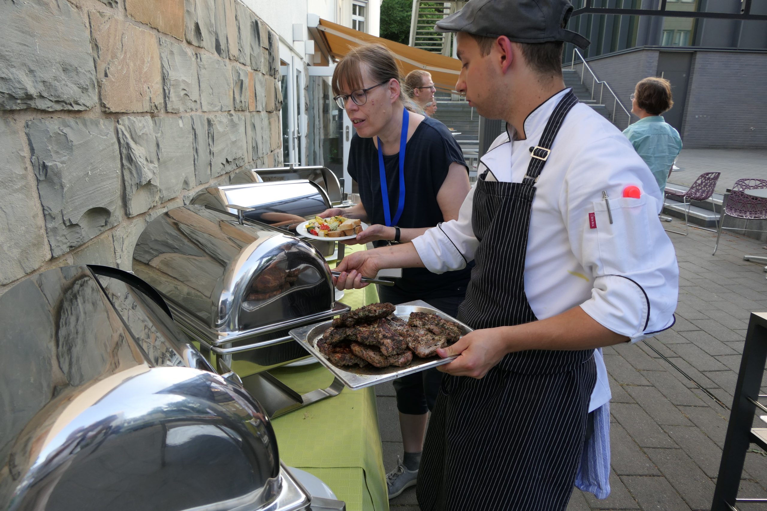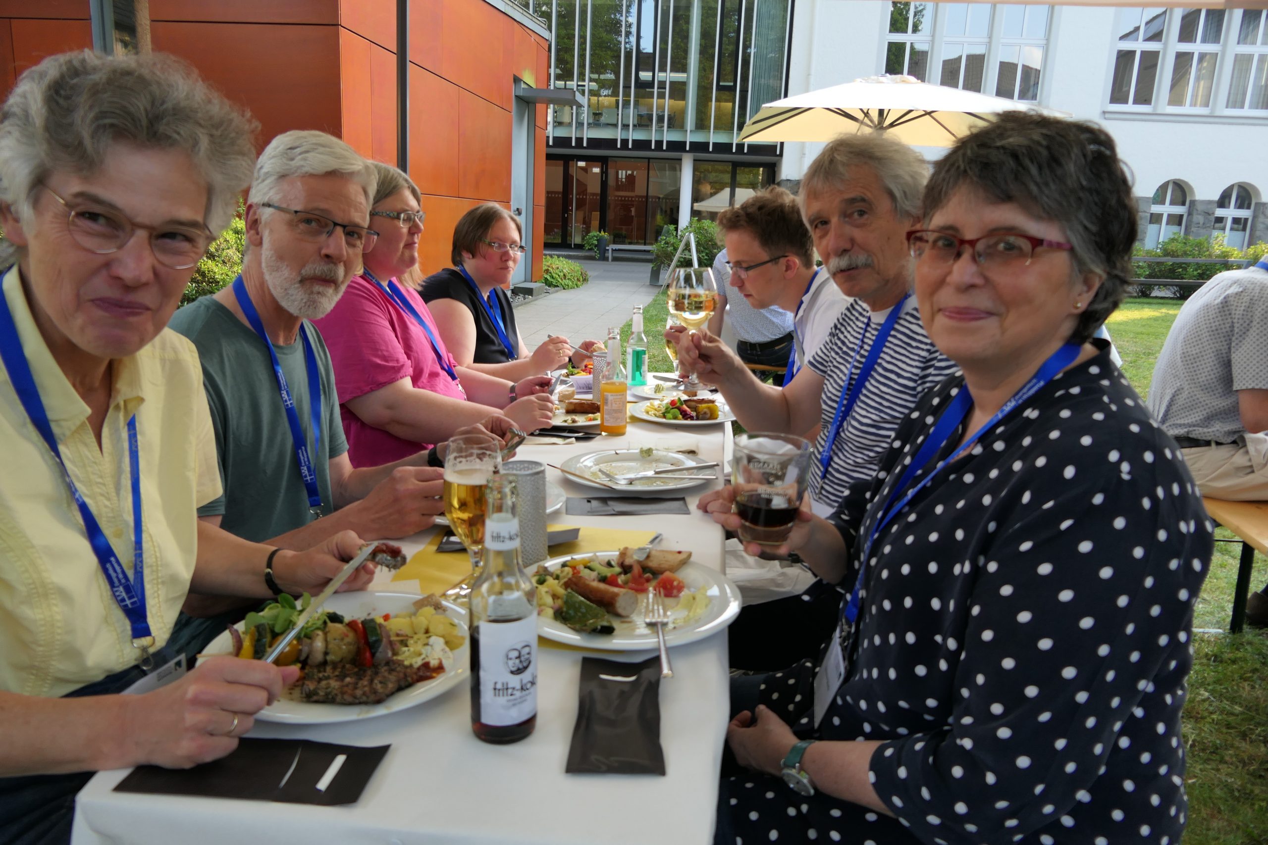 Um 19.00 Uhr startete der gesellige Teil des Abends und der persönliche Austausch auf der Campus- Wiese. Die Mitarbeitenden des Internationalen Evangelischen Tagungszentrums „Auf dem heiligen Berg“ hatten dank des hervorragenden Wetters nicht nur Bänke und Tische, sondern auch Grill und Theke nach draußen verlagert. Beste Voraussetzungen, um einen lauen Sommerabend mit alten Bekannten zu genießen.