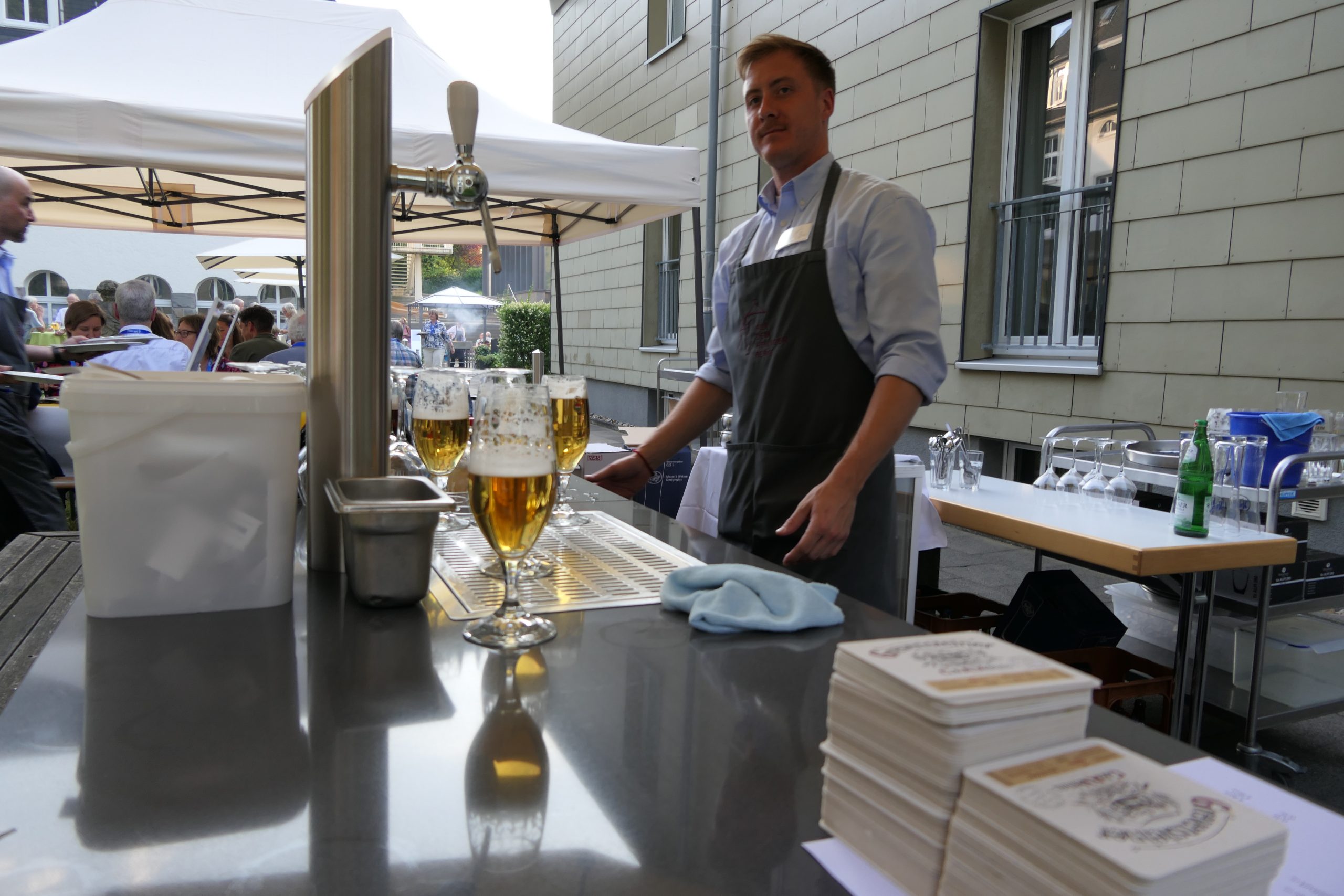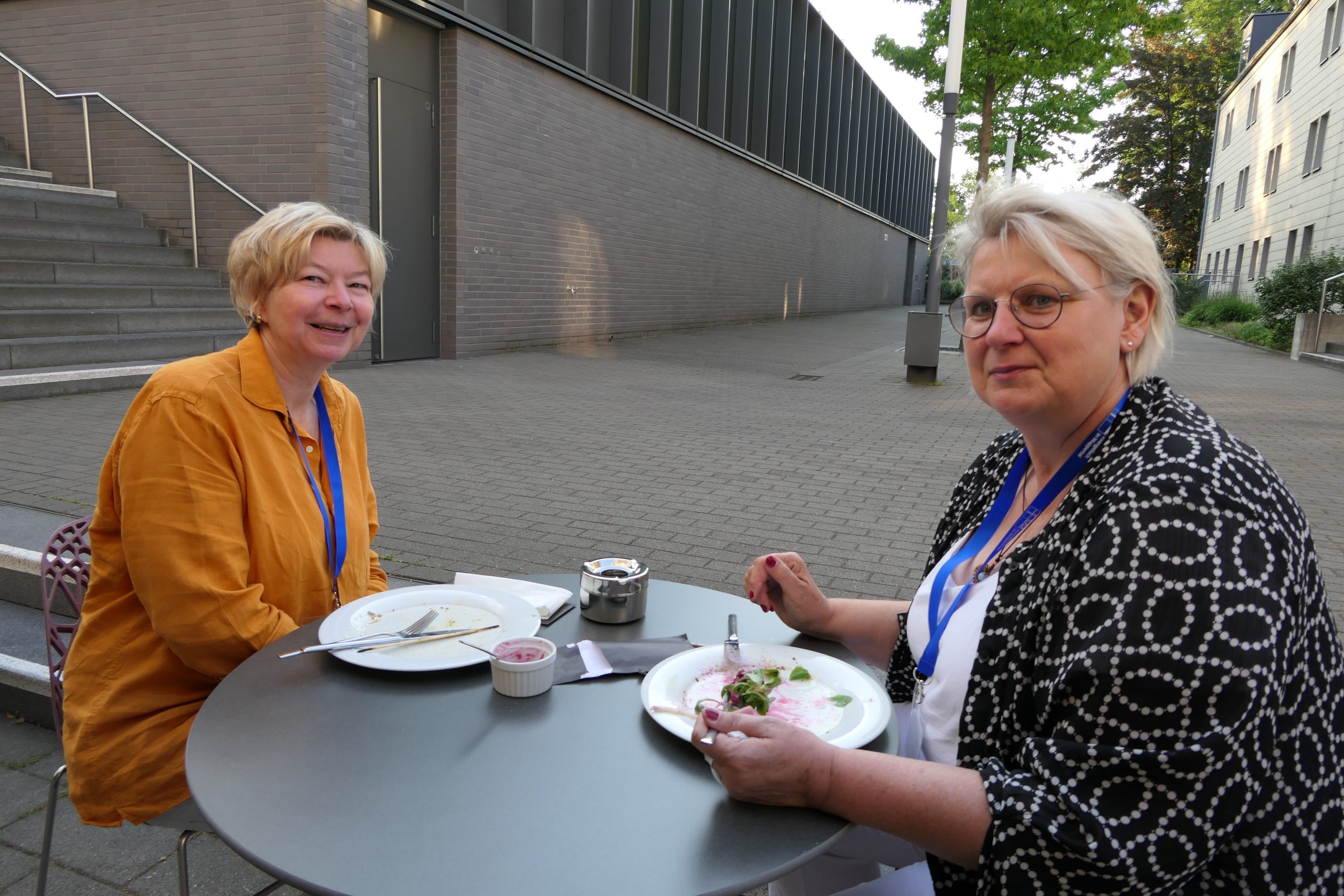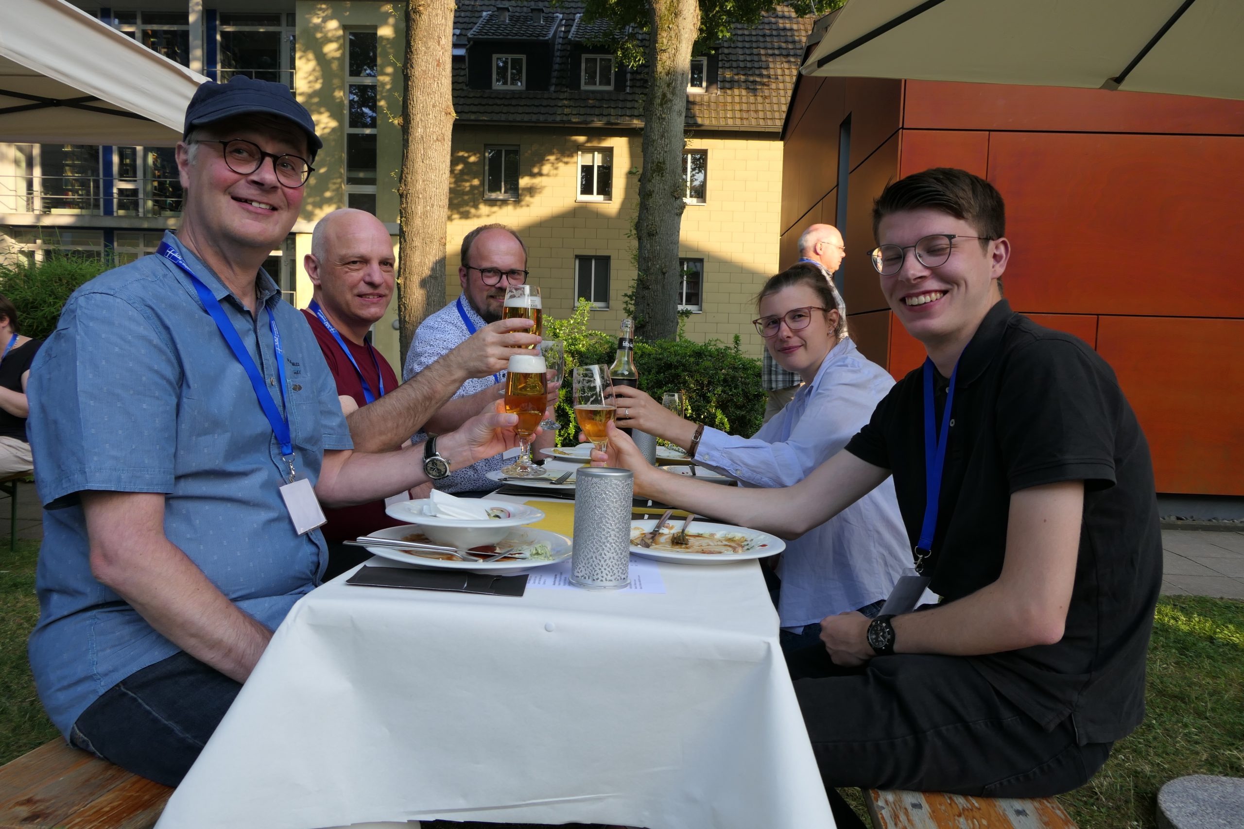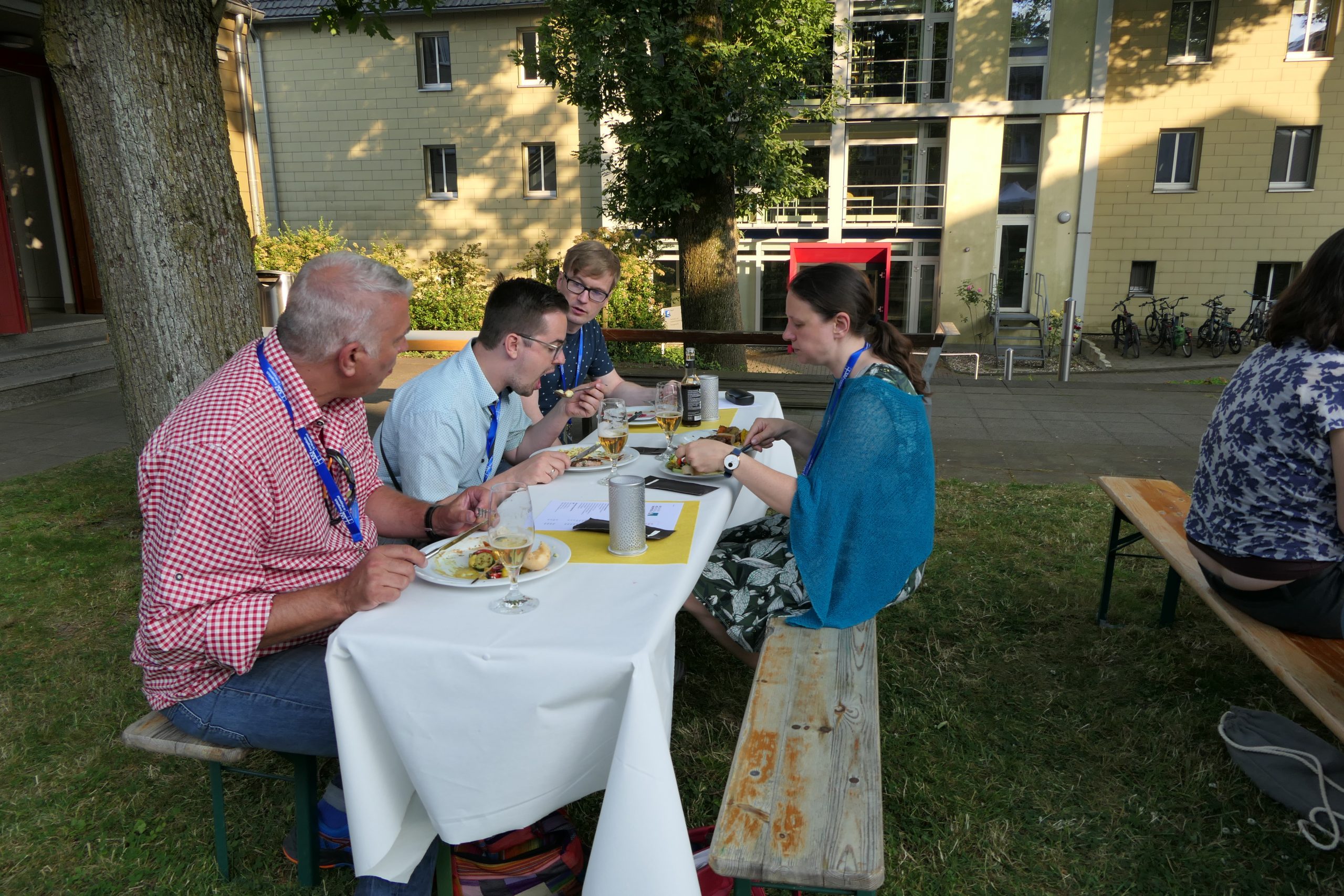 Um 19.00 Uhr startete der gesellige Teil des Abends und der persönliche Austausch auf der Campus- Wiese. Die Mitarbeitenden des Internationalen Evangelischen Tagungszentrums „Auf dem heiligen Berg“ hatten dank des hervorragenden Wetters nicht nur Bänke und Tische, sondern auch Grill und Theke nach draußen verlagert. Beste Voraussetzungen, um einen lauen Sommerabend mit alten Bekannten zu genießen.